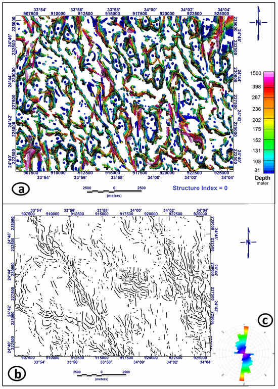 The Euler deconvolution (ED) method is employed to combine geological and geophysical constraints into a depth map that shows the contact structural index (SI). The amplitude function of ED is consistently positive and not dependent on the body magnetization direction [45]. The ED method primarily relies on the SI, which is directly related to the shape of the contributing source. The optimal source locations are identified based on the least square inversion of the data within a specified window length. The variations in SI values assist in identifying different magnetic bodies. Figure 6a illustrates the application of Euler deconvolution to reduced-to-pole (RTP) magnetic data for mapping magnetic contact distributions, delineating their spatial positions and depths across multiple computational intervals. The analysis was conducted using Oasis Montaj software with a structural index (SI) of 0, consistent with magnetic contact geometries [46]. The results reveal NNW-SSE-, N-S-, NNE-SSW-, and E-W-trending contacts, with estimated depths ranging from 0.081 km to 1.5 km adjacent to basin structures and/or uplifted crustal blocks. Comparative analysis with the RTP map (Figure 3) indicates the clustering of step faults along zones of positive and negative magnetic anomalies, interpreted as uplifted and downthrown blocks, respectively. Directional trends such as NNW-SSE, N-S, NNE-SSW, and E-W are commonly derived from lineament maps (Figure 6b), which represent structural features like faults, fractures, and geological boundaries. These trends provide insights into the tectonic framework and stress orientations of a region (Figure 6c).