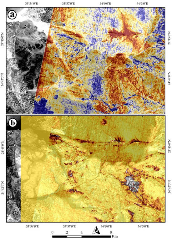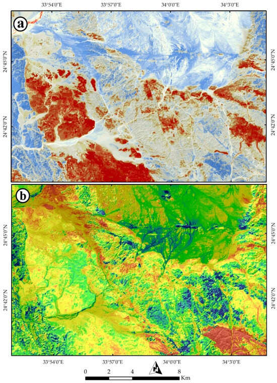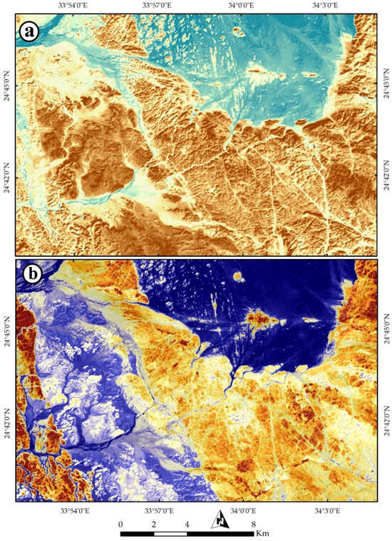 Pseudocolor ramps of Landsat 9: (a) PC1 effectively differentiating rock units (pale brown) from wadi deposits (blue), and (b) MNF1 highlighting the NW-trending Natash volcanics and the unconformity surface between the basement (brown) and Phanerozoic rocks (blue).