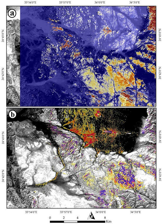 SMACC results: (a) endmember 3 and (b) endmember 8, highlighting granitic rocks and their surroundings with distinct colors, primarily representing their weathered products.