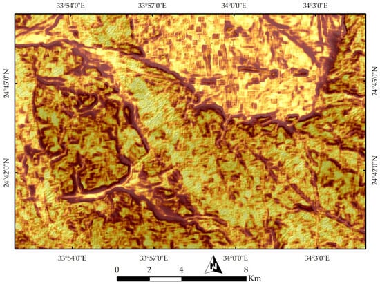In 1983, the Aero-Services organization conducted an aeromagnetic survey in the study region as part of the Mineral, Petroleum, and Groundwater Assessment Program (MPGAP). A proton magnetometer (Varian, V-85) was selected for the aerial survey due to its high sensitivity (0.01 nT). The flight path was northeast–southwest and consisted of 25° and 225° crossed lines separated by 1.5 km lines. The flight path followed tie-lines with an azimuth of 135 degrees and 315 degrees and a separation of 5 km. For more accurate results from the survey, the control time was synchronized with worldwide time through shortwave radio [33]. After cleaning and plotting the data, a complete map of the aeromagnetic intensity was produced. In this investigation, digitized data followed primary data collection, and the results are shown as a colored fill on a map (Figure 3a).