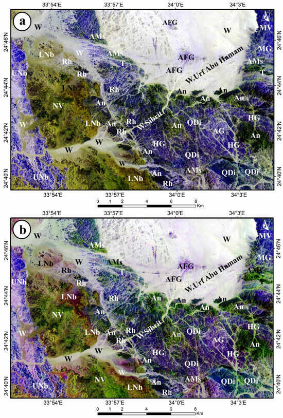 (a) ASTER FCC image 432 in (RGB). Abbreviations: (NV) Natash volcanic, (UNb) Upper Nubian sandstone, (LNb) Lower Nubian sandstone, (An) andesites, (HG) hornblende granite, (AFG) alkali feldspar granite, (AG) alkali granite, (W) wadi deposits, (Rh) rhyolite, (QDi) quartz diorites, (MG) metagabbros, (MV) metavolcanics. (AMs). (b) ASTER FCC image 731 in RGB.