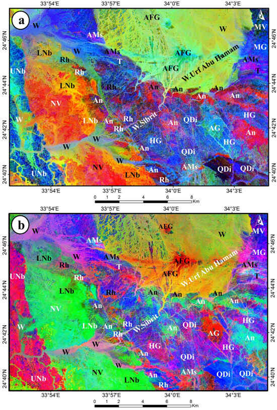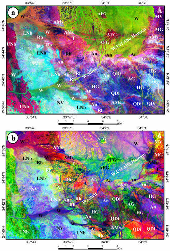 (a) ASTER band ratio (4/7, 3/4, and 2/1 in RGB) (modified after [46]). (b) ASTER band ratio (6/8, 4/5, and 2/4 in RGB) (modified after [47]).