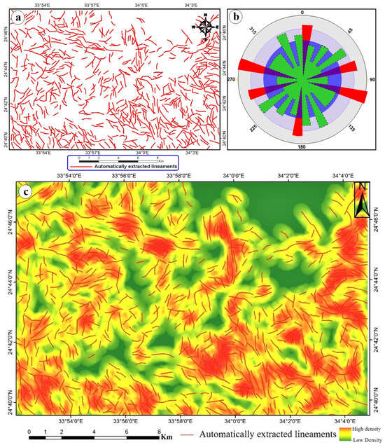The spatial resolution of the images has a significant impact on the accuracy of the lineaments that are retrieved. A higher-quality lineament map is produced by using images with higher resolution [57]. On this basis, the PC1 is fused to achieve a higher spatial resolution (15m). Because automatically extracted lineaments may have an expression of error or other linear weakness [57], visual inspections of the extracted lineaments have been carried out for editing and eliminating false (incorrect) lineaments such as roads, routes, buildings, and any other manmade features. Figure 16a depicts the automatically derived lineaments following editing to remove artificial characteristics. The directional analysis of the automatically extracted lineament maps and rose diagram shows (Figure 16b) that there are main faulting trends that have been recognized, which are NW-SE, NNE-SSW, and N-S (in a descending manner). Density depends on the number of lines per unit area (number/km), the total length of the lines in each unit area (number/km2), or a combination of them.