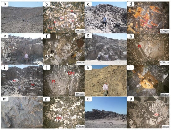 (a) Photographs showing altered and sheared metabasalts at Wadi Sibrit–Urf Abu Hamam district, looking SW. (b) Plagioclase (Pl) laths associated with quartz (Qtz), (C.N.). (c) Intensely jointed and fractured metagabbros at Wadi Sibrit–Urf Abu Hamam district, looking NE. (d) Plagioclase (Pl) and pyroxene (Pyx) crystals showing subophitic texture (C.N.). (e) Fractured quartz diorite in Urf Abu Hamam district. (f) Zoned plagioclase (Qtz) partially altered in the core (C.N.). (g) Highly fractured Dokhan volcanics (rhyolite) at the studied district, looking NW. (h) Orthoclase crystal partially altered to sericite and clay minerals (C.N.). (i) Acidic dyke extruded within Dokhan (An) volcanics at the studied district, looking W. (j) Phenocryst of plagioclase (Pl) altered to sericite set in fine-grained groundmass of quartz (Qtz) and epidote with secondary quartz (C.N.). (k) Highly jointed hornblende granites at Wadi Sibrit district. (l) Corrosion of plagioclase (Pl) in hornblende crystal (Hbl), (C.N.) (m) Highly sheared alkali granite at Wadi Sibrit district, looking S. (n) Euhedral crystal of altered plagioclase with graphic texture (C.N.). (o) Highly weathered low masses of alkali feldspar granites, Wadi Urf Abu Hamam district, looking NW. (p) Plagioclase (Pl) and quartz (Qtz) showing graphic texture (C.N.).