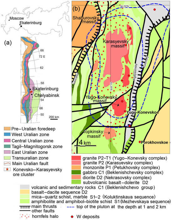 Six near-longitudinal zones are distinguished in the southern segment of the Urals fold belt: the Pre-Uralian foredeep and West Uralian, Central Uralian, Magnitogorsk, East Uralian, and Transuralian zones (Figure 1) [42,43]. The first three zones represent the passive margin of the Russian Platform, which formed in the Late Cambrian–Early Ordovician, evolved from the Ordovician to the Devonian, and was deformed in the Carboniferous–Permian, when it became part of the Urals fold belt [43]. The Magnitogorsk and East Uralian zones comprise Paleozoic rocks of mid-ocean ridges (ophiolites), island arcs, Andean-type belts, flysch troughs, and intra-arc basins. They are separated from the complexes of the Russian Platform by the Main Uralian Fault, which is one of the largest sutures in Eurasia [42,43]. Tungsten mineralization is controlled mainly by Carboniferous–Permian granitoid intrusions associated with the Hercynian collision and is mainly associated with the Mo, Be, and Bi mineralization of vein quartz and stockwork facies of greisens, skarns, and gumbeites (feldspathic metasomatic rocks) [41,43].