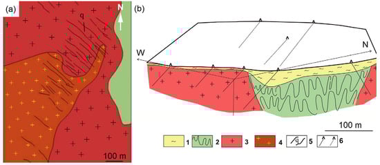 (a) Geological map, with overburden removed, of the Yugo-Konevskoe deposit [41] and block diagram of the Yugo-Konevskoe deposit (created by K. Novoselov on base prospection works) (b): 1—loam; 2—amphibole schists of the Lower Silurian Mezhevskaya Sequence, 3–4—Middle Permian–Lower Triassic Yugo-Konevsky pluton, 3—biotite granite of the first phase and unspecified granite (on block diagram), 4—leucocratic granite of the second phase, 5—ore quartz veins, 6—boreholes.