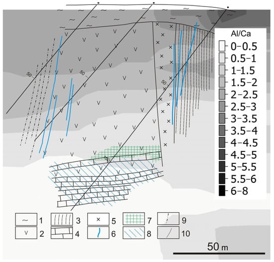 Geological section through the central part of the Porokhovskoe deposit: 1—loam; the Lower Silurian rocks of Mezhevskaya Sequence: 2—alternation of metamorphosed intermediate volcanic rocks and volcaniclastic rocks, 3—epidote–actinolite schist, 4—marble; 5—diorite porphyrite; 6—W-bearing quartz veins; 7—garnet–epidote–pyroxene skarn; 8—greisen stockwork; 9—disintegrated rocks of the fault zone; 10—borehole. The Al/Ca ratio shows the relationship between alumosilicate and calcareous rocks.