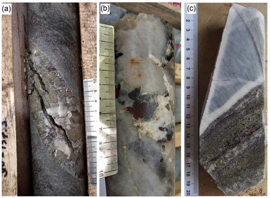 Ore veins at Porokhovskoe deposit: (a) Pyrite–muscovite–quartz vein with light rims in meta-andesites; (b) quartz vein with zonal distribution of wolframite and scheelite; (c) pyrite–fluorite vein in marbles.
