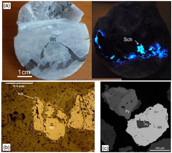 Wolframite (Wt) from ores of Porokhovskoe deposit: (a) wolframite and scheelite (Sch) in quartz vein (sample in normal and ultraviolet light); (b) wolframite crystals with scheelite rims (reflected light); (c) fluorite (Flr) inclusion in wolframite (BSE image). Pyrite—Py.