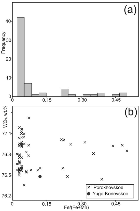 Variations in composition of wolframite on histogram of Fe/(Fe + Mn) ratio for all analyses (n = 64) (a) and on binary diagram for Yugo-Konevskoe and Porokhovskoe deposits (b).