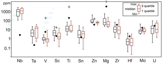 - Ti, Zr, Hf, and maybe Sn: Elements without a pronounced enrichment/depletion. The interquartile range of content for Zr and Hf in wolframite from the Porokhovskoe deposit is narrower than in wolframite from the Yugo-Konevskoe deposit.