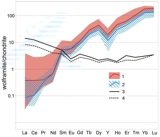 Chondrite-normalized REE patterns: 1—interquartile range and median for wolframite of the Yugo-Konevskoe deposit; 2—the same, for the Porokhovskoe deposit; 3—granite of the Yugo-Konevsky pluton (123/31.9–32.3); 4—greisenized granite of the Yugo-Konevsky pluton (123/30).
