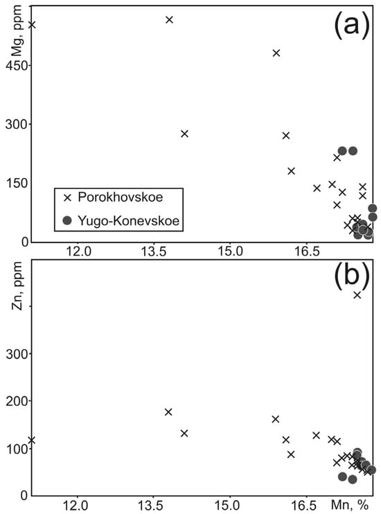 According to our data [51], the MgO content of muscovite from quartz–muscovite veins and greisenized skarnoids reaches 3.93 and 5.94 wt.%, respectively. Chlorite from skarnoids with the ore mineralization of the Porokhovskoe deposit contains up to 8.31 wt.% MgO. This high content indicates the high activity of Mg in the fluid. An almost twofold increase in the median Mg content of wolframite of the Porokhovskoe deposit compared to the Yugo-Konevskoe deposit is possibly due to the interaction of the fluid with intermediate to mafic volcaniclastic rocks, the MgO content of which is significantly higher than that of granites. The Mg content of the wolframite of both deposits is negatively correlated with Mn content, –0.87 for the Porokhovskoe deposit and –0.68 for the Yugo-Konevskoe deposit (Figure 9), which indicates the isomorphic state of Mg in position A of the wolframite.