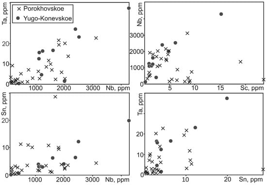 Binary diagrams of Nb-Ta, Nb-Sc, Nb-Sn, Ta-Sn for wolframite from the Porokhovskoe and Yugo-Konevskoe deposits.
