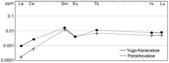 Calculated REE content of the hydrothermal fluid in equilibrium with wolframite at the Yugo-Konevskoe and Porokhovskoe deposits. The median content was used for the calculation. The partition coefficients were taken from [62].