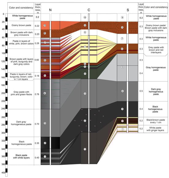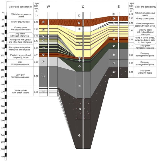 During the drilling of five sediment columns, the sediment thickness ranged from 182 to 380 cm. The consistency of all sediments was homogeneous paste-like, except for isolated yellow crystals observed in the middle section of core W. Additionally, the brown sediment layer in the upper part of the cores exhibited a porous, granular texture. Each core typically contained 9–10 distinct layers, varying significantly in color (from white and cream to deep black). The stratigraphic sequence of sediment layers along the W–C–E and N–C–S transects is illustrated in Figure 2 and Figure 3. The upper white layer in cores W, N, and S is shown schematically. This layer was identified during the site inspection, but an undisturbed sample could not be collected during drilling.
