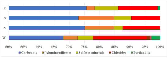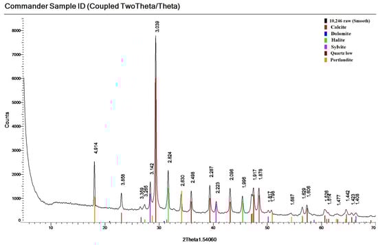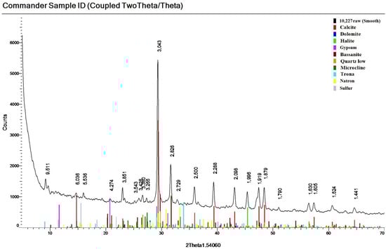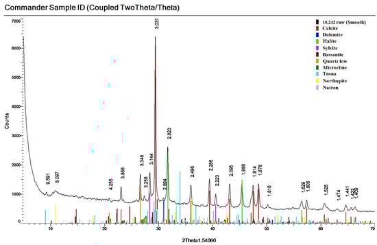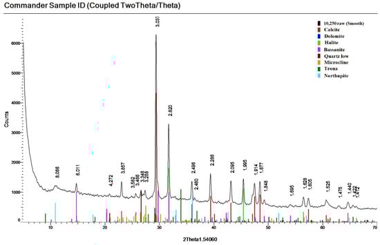 The calcite content of the crystalline phase in the samples studied varies from 39.9% to 88.4%. This mineral is formed by fine precipitation from the liquid phase of pulp, which is a waste at the ammonia method of soda production [34]. Together with calcite, due to the presence of magnesium and sodium in the solution other carbonates, dolomite CaMg(CO3)2 and soda Na2CO3∙10H2O (natron), as well as complex transitional carbonate phases nortupite Na3Mg(CO3)2Cl and trona Na3H(CO3)2·2H2O, were precipitated (Figure 6). On average, the crystalline phase of all the studied samples contains 71% carbonate minerals (Table 1).
