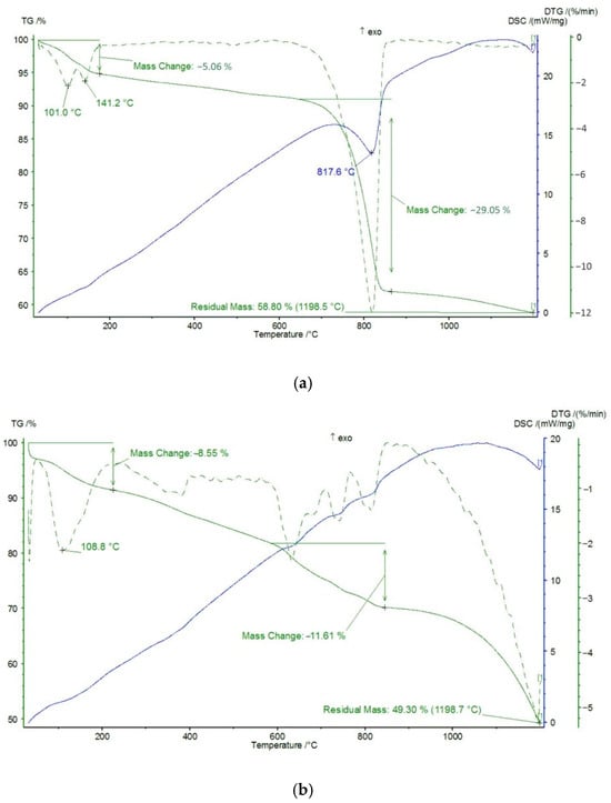 The following methods of thermal analysis were also used to study the samples synchronously combined within one experiment: differential scanning calorimetry (DSC), based on the registration of thermal effects accompanying physical transformations and chemical reactions occurring with the substance during heating; thermogravimetric (thermo-weight) analysis (TGA), based on obtaining and studying the patterns of changes in the mass of the substance during heating. The main results of the thermal analysis are thermal curves (heating curves)—thermograms—which allow us to quantitatively evaluate the main processes occurring with the substance during heating and provide additional information on the forms of elements, including the amorphous phase. Experimental studies were carried out on the synchronous thermal analyzer STA 409 PC Luxx from Netzsch-Geratebau GmbH (Selb, Germany). The samples, after grinding, were placed in a corundum crucible and heated to a temperature of 1200 °C at a rate of 30 °C per minute. The samples were investigated in a dynamic gas atmosphere using Ar (gas flow rate of 10 mL/minute for the weighing system, and 20 mL/minute for the measuring chamber).