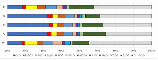 The third most widespread component of the sediment composition is chlorine. Its average content increases from west and south (8.1 wt.%–9.2 wt.%) to east and north (11.6 wt.%–13.7 wt.%). The content of sulfur compounds (SO3) and LOI increase in the western and eastern parts of the pond, about 2 times higher than in the central columns. The specificity of sediment composition from the western part of the site (by column W) consists of a higher content of sodium and, especially, potassium oxides.