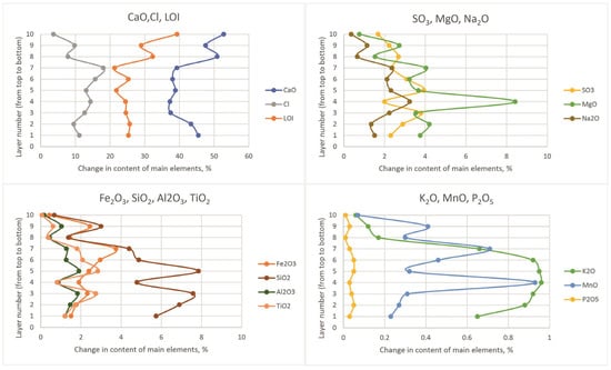 The general trends of chemical composition change with depth can be seen in Column C, equidistant from the sources of previous wastewater discharge. Our analyses of Figure 11 show a decrease in potassium and chlorine content from the lower to the upper layers. The maximum magnesium content occurs in the middle interval of the section. The content of Al2O3, SiO2, Fe2O3, TiO2, and MnO in the upper layers changed under the influence of single factors. For the other columns, these trends are also true, taking into account the greater contrast of compositional changes in columns W and S, located in the area of former sewage discharge. The variation of sediment composition by depth in columns N, E, S, and W is shown in Figure S2.