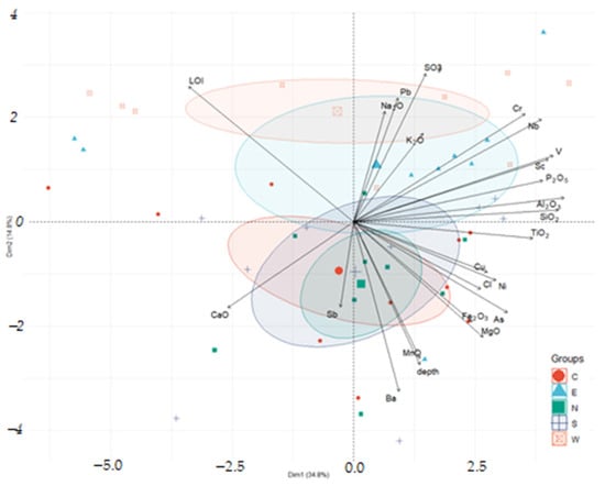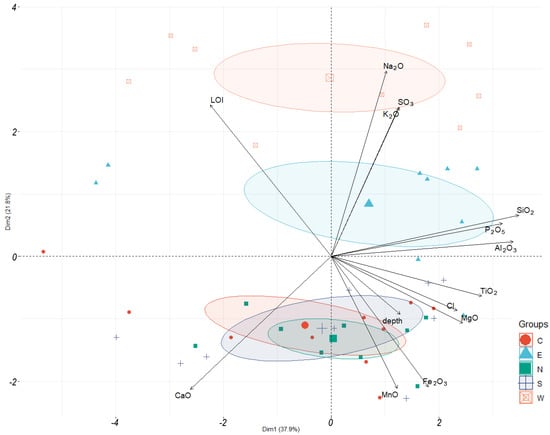 Based on the XRF results from layer samples of each core, we compiled a comprehensive database incorporating oxide weight percentages, loss on ignition (LOI), and sampling depths. These data were subjected to principal component analysis (PCA). Prior to analysis, all concentration data were log-transformed for normalization. The analysis identified two principal components (PCs) that collectively explain 61.2% of the total variance (PC1 = 42.7%, PC2 = 18.5%). The results were visualized using the ggbiplot package in R, displaying variable vectors and sample groups (cores) on a biplot (Figure 12).