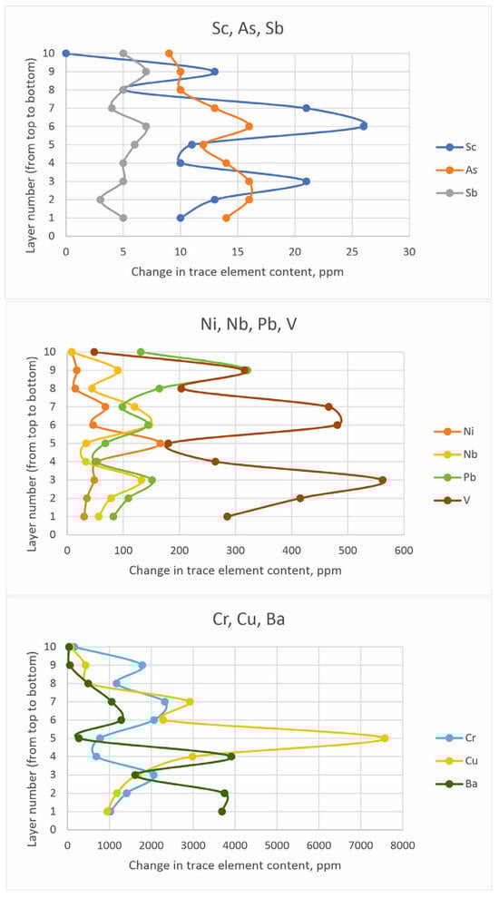 Antimony and arsenic are most uniformly distributed along the depth. The content of scandium in the samples is also relatively uniform, except for layer C8 in the upper part of the column, where its concentration decreases several times. Nickel and copper concentrations change in a very similar way: a gradual increase from the lower layers to the C5 layer with a gradual decrease to the upper part of the section. Chromium, lead, niobium, vanadium, and barium are characterized by higher concentrations in the lower layers, a decrease in layers C4 and C5, an increase in layers C6–C8, and a further decrease towards the top of the section. The variation of trace components in sediment composition with depth in columns N, E, S, W is shown in Figure S3.