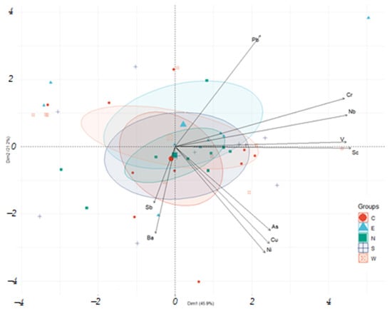 To determine the distribution patterns of trace elements in sediments, PCA was performed on a sample of trace elements, as well as on a combined sample of micro and macro components of sediments (Figure 14 and Figure 15). Looking at the PCA results in Figure 14, correlated groups of elements (Pb, Cr-Nb-V-Sc, As-Cu-Ni, and Sb-Ba) can be observed.