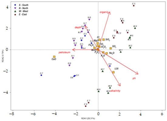 By analyzing the vectors of variables, we can identify the components of the material composition of the solid phase of the sediments, the content of which in the solid phase of the sediments is mutually correlated. Thus, the contents of silicon, phosphorus, and aluminum oxides correlate with each other and with the first principal component PC1. Chlorine, titanium, and magnesium oxide can be identified in another similar group. The content of manganese (by MnO) and iron (by Fe2O3) increases with increasing sampling depth, with an inverse correlation of the content of these components being observed in comparison with the loss on ignition (LOI). The contents of potassium and sodium oxides are closely related to each other and also correlate with the sulfur content (by SO3), and all of them together with the second major component of PC2.