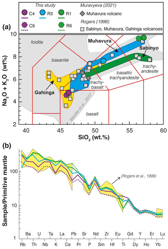 (a) Total alkalis versus silica (TAS) diagram after [24] and (b) primitive mantle normalized multi-element diagram (primitive mantle normalizing values from [25] for the lava samples from the eastern Virunga Volcanic Province analyzed in this study). Colored fields in (a): grey field refers to the compilation of VVP lavas [13]; green, yellow, and blue fields envelop the data from the literature available for lava from the Sabinyo, Muhavura, and Gahinga volcanoes [18,21]. The yellow field in (b) envelops the literature data available for lava from the Sabinyo, Muhavura and Gahinga volcanoes [21].