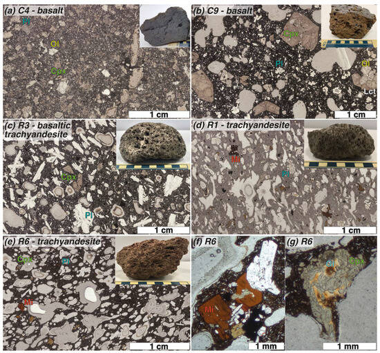Low-magnification thin-section images showing the textures and petrographic features of the investigated lava samples. The images are reported following the whole-rock chemical evolution inferred from the TAS diagram of Figure 2: (a) C4 and (b) C9 basalts; (c) R3 basaltic trachyandesite; (d) R1 and (e–g) R6 trachyandesites. Hand sample view is shown at the top-right of each image. Gl = glass, Ol = olivine, Cpx = clinopyroxene, Pl = plagioclase, Lct = leucite, Mica = Mi.