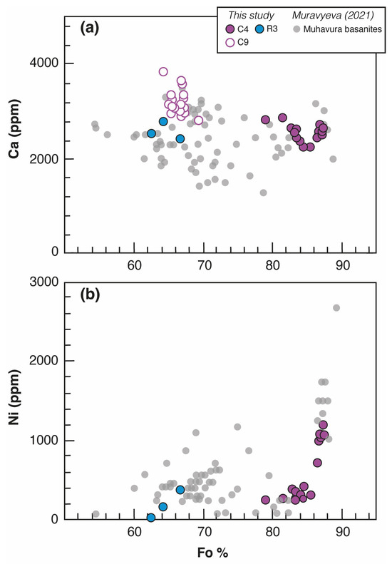 The analyzed olivine crystals refer to the C4 and C9 basalts, as well as R3 trachyandesite (Figure 3a–c and Figure 4a,b). The Fo content is higher in the C4 basalt (Fo80–90) than in the C9 basalt (Fo65–70) and the R3 trachyandesite (Fo62–67). Ni correlates inversely with Fo, with C4 olivine exhibiting the highest Ni content (up to 1200 ppm; Figure 5a). The analyzed olivine crystals show a narrow variation in Ca content (2300–4000 ppm), despite a relatively large variation in Fo (Figure 5b).