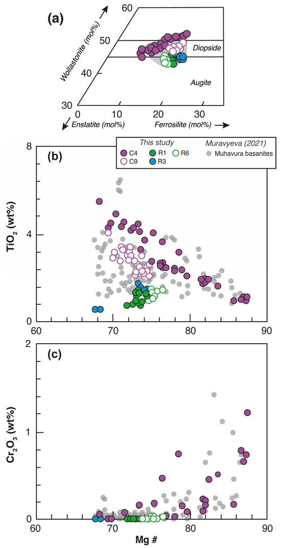 Compositions of clinopyroxene hosted in the investigated lava samples. (a) Inset of wollastonite–enstatite–ferrosilite classification diagram (boundaries after [26]). (b) Mg# (mol%) versus TiO2 (wt%). (c) Mg# (mol%) versus Cr2O3 (wt%). Literature data of clinopyroxene crystals hosted in two basalts from the Muhavura volcano [18] are reported for comparison.