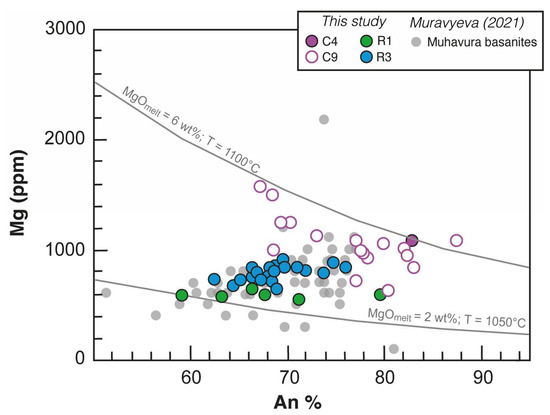 An content (mol%) vs. Mg concentrations for plagioclase hosted in the investigated lava samples. Measurement uncertainties (1SD) are smaller than the symbol size. Solid lines represent Mg-plagioclase partitioning curves calculated using equations and coefficients from [27] for two melts having MgO contents and temperatures as indicated along the curve. Literature data of plagioclase crystals hosted in two basalts from the Muhavura volcano [18] are reported for comparison.