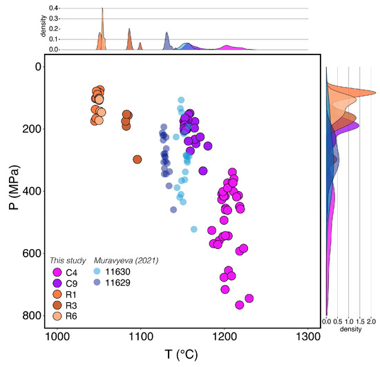 Temperature and pressure values for equilibrium clinopyroxene–melt pairs were estimated using the model based on the machine learning algorithm from [33], which yields uncertainties of 36 °C and 210 MPa, respectively. For each of the studied lava samples, the pressure estimates define a wide range while the temperature estimates span a narrow range (Figure 8). In detail, clinopyroxene from C4 and C9 basalts records the highest temperature values (1200 °C and 1175 °C, respectively), with pressure estimates ranging from 150 to 340 MPa for C9 and from 350 to 800 MPa for C4. More evolved lava samples yielded much lower temperature and pressure values (i.e., 1100 °C and 150–300 MPa for the R3 basaltic trachyandesite; 1050 °C and 100–200 MPa for the R1 and R6 trachyandesites).