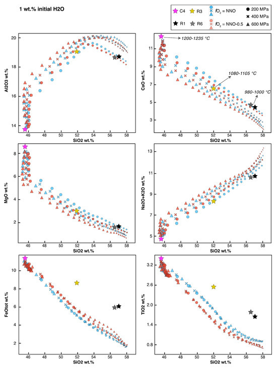 Liquid line of descent calculated using Magma Chamber Simulator [6,38,39]. Only results of simulations performed with 1 wt% of initial H2O content are reported, which are found to be the best match with the composition of natural whole rocks (reported as filled stars). The arrows indicate the approximate temperature at all given points of the simulated differentiation paths.