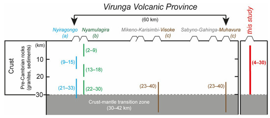 Schematic illustration showing constraints on magma storage depths beneath the VVP volcanoes from previously published studies and this study. (a) Nyiragongo [12]. (b) Nyamulagira [20]. (c) Visoke and Muhavura [18]. The data provides evidence for several crystallization levels within the magmatic plumbing system under the VVP. The first level corresponds to the lower crust, where mantle-derived magmas stall and fractionate an assemblage made dominantly of olivine and clinopyroxene. Further fractionation also involving crystallization of plagioclase and feldspathoids occurred during the rise of magma toward the surface in shallower magmatic zones and led to the genesis of the evolved terms of the VVP magmatic suite. The crust–mantle transition zone beneath the VVP is from [42].