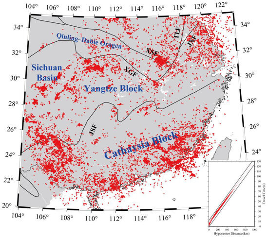 In this study, the seismic travel-time data were extracted from seismic phase reports of local earthquakes, which were provided by the Second Monitoring Center of the China Earthquake Administration. Local earthquakes were selected according to the following two primary criteria: (1) that each epicenter was situated in the range of 104°–123° E longitude and 20°–35° N latitude, (2) that each event was recorded at five or more seismic stations. As a result, our dataset contains 82,175 local earthquakes recorded at 678 permanent stations (Figure 1 and Figure 2). The earthquakes primarily occurred in coastal regions and along the southwestern Yangtze block. However, a few events occurred in the central part of the study region. After the removal of outliers beyond the travel-time curve, a total of 238,971 high-quality P-wave arrival-time data are used for tomographic inversion (Figure 2).