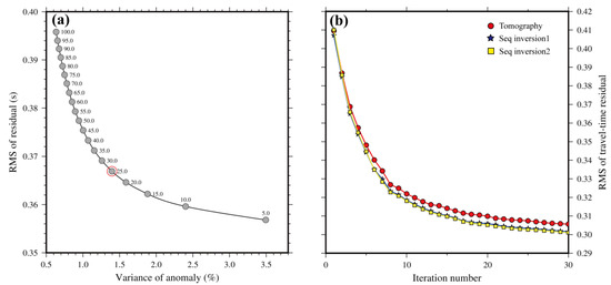 (a) The trade-off curve for the root-mean-square (RMS) travel-time residual versus the norm of the 3-D Vp model. The optimal damping parameter is highlighted with a red circle. (b) The convergence curve of the joint inversion between the number of iterations and the RMS travel-time residual. The red, blue, and yellow curves represent the RMS values in the single seismic tomography, the first sequential inversion, and the second sequential inversion, respectively.
