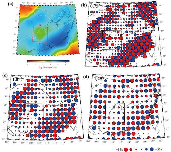 (a) Distribution of seismic ray density at 15 km depth. A1 outlined by the red box represents area where ray crisscrossing is poor. (b–d) Checkerboard resolutions test results at 15 km depth for grid spacings of 0.75°, 1.0°, and 1.25°, respectively. Vp perturbation scale shown at bottom. Black box same as red box in (a).