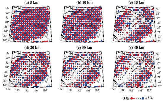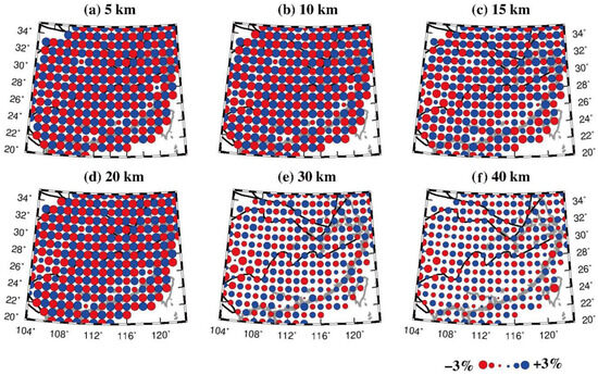 Spatial resolution analysis is crucial for geophysical inversion. We use the checkerboard resolution test (CRT) to identify the best grid spacing [17]. We firstly establish a 3-D grid in the study volume. We perform the three CRTs, and the horizontal grid intervals are taken to be 1.25°, 1.0°, and 0.75°, respectively. The vertical grid interval is set to 5 km in the shallow layers and to 10 km in the deeper layers (Figure 5b–d). Secondly, Vp anomalies of ±3% based on the 1-D IASP91 model [61] are alternately assigned to adjacent grid nodes to construct a checkerboard Vp model (the synthetic model). Thirdly, we employ the 3-D ray-tracing scheme [17] to compute theoretical travel times for the synthetic model. The synthetic data are contaminated with random noise with a deviation of 0.1 s to simulate picking errors. Finally, the synthetic travel times with random noise are inverted to generate a 3-D Vp model (the output model). Figure 5 shows the results of the three CRTs at 15 km depth with varying grid intervals. Comparing these test results, the optimal grid interval is determined to be 1.0° according to the pattern of recovered Vp anomalies. Figure 6 shows that the resolutions at depths greater than 10 km beneath the central part of SCB are lower, because P-wave rays do not crisscross well there (Figure 5a).