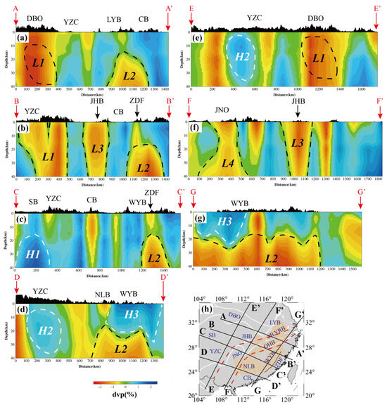 Figure 10 shows seven vertical cross-sections of Vp tomography across the study area, in which four profiles are parallel to the Qinling-Dabie orogenic belt (AA’–DD’) and the other three profiles are perpendicular to it (EE’–GG’). Along the AA’, BB’, and EE’ profiles, there is a prominent low-Vp anomaly (L1) beneath the western Qinling–Dabie orogenic belt (DBO), extending throughout the entire crust (Figure 10a,b,e). In the AA’ profile, a distinct low-Vp anomaly (L2) in the lower crust is also identified beneath the Lower Yangtze block (Figure 10a). Similarly, in the DD’ and GG’ profiles, L2 is clearly concentrated in the lower crust beneath the Wuyi metallogenic belt, whereas a strong high-Vp anomaly (H3) exists in the upper crust (Figure 10d,g). In the BB’ and CC’ profiles, a pronounced low-Vp anomaly is detected beneath the Zhenghe-Dapu fault zone, which could serve as a principal channel for magmatic upwelling [21]. In the BB’ and FF’ profiles, the distinct low-Vp anomalies L3 and L4 appear beneath the Jianghan basin and the eastern Jiangnan orogen, respectively (Figure 10b,f). In the CC’ profile, a high-Vp anomaly (H1) appears in the middle–lower crust beneath the Sichuan basin (Figure 10c), exhibiting a cratonic feature. In addition, a distinct high-Vp anomaly (H2) is imaged beneath the southwestern Yangtze Craton along the DD’ and EE’ profiles (Figure 10d,e).