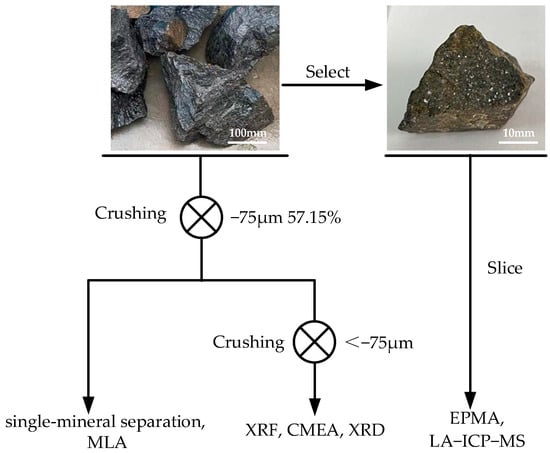 Ore samples were collected from the Manjiazhai ore segment of the Dulong deposit. Because the mine adopts a production method of mixed mining and mixed selection, the obtained ore samples were mixed raw ores mined from this ore segment. To ensure the representativity of the samples, 50 kg of ore samples was randomly selected from the stockpiling plant of the mine and crushed to −75 μm accounting for 57.15%, and then thoroughly mixed and sample compositing until the material became homogeneous. A 500 g portion of sample was split out and ground to −75 μm for X-ray fluorescence (XRF), chemical multi-elemental analysis (CMEA), and X-ray diffraction (XRD) analysis. A 2 kg portion of sample was used for single-mineral separation analysis, and 100 g of sample was used for mineral liberation analysis (MLA) and electron probe microanalysis (EPMA), the latter after being inlaid with resin. The sample preparation process is shown in Figure 2.