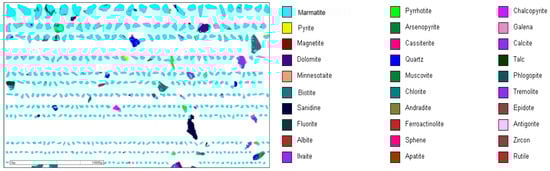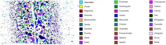 Mineral particles were analyzed via MLA to determine the mineralogical composition of the ore, with the results shown in Table 4 and Figure 3 and Figure 4.