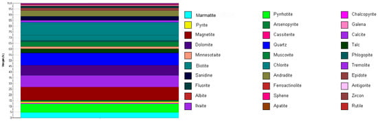 The ore consisted of 30 different minerals, with the principal metallic minerals being magnetite (11.01%), pyrrhotite (6.12%), and marmatite (5.14%). The ore also contained trace amounts of chalcopyrite (0.66%), pyrite (1.02%), and arsenopyrite (0.98%). The oxide minerals were predominantly calcite (11.02%), dolomite (9.07%), quartz (11.12%), chlorite (11.47%), talc (5.26%), and mica (10.37%).