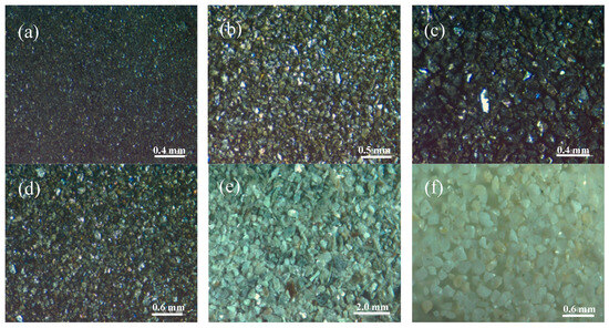 Microscope images of the main ore minerals: (a) magnetite, (b) marmatite, (c) chalcopyrite, (d) pyrrhotite, (e) silicate minerals (mainly chlorite, mica, and small amounts of talc, tremolite, and potassium feldspar), (f) carbonate minerals (mainly calcite and dolomite).