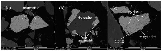 Marmatite was found to be the main carrier mineral of indium; hence, we conducted a systematic investigation into the occurrence state and enrichment mechanism of indium within marmatite. Our EDS analysis (Figure 6 and Table 9) showed that the marmatite contained 55.1% Zn, 10.8% Fe, and 34.1% S, on average. Combined with MLA (Figure 7) and SEM–BSE (Figure 8) data, the textural characteristics of marmatite can be summarized as follows: some marmatite occurs as single dissociated particles (Figure 8a); some marmatite has a close intergrowth relationship with metallic minerals such as pyrrhotite, chalcopyrite, pyrite, and magnetite, with the intergrowth mainly consisting of inlaid distribution and adjacent intergrowth (Figure 8c–e); some marmatite exhibits intergrowth with oxide minerals (calcite, dolomite, quartz, chlorite, and biotite), with the intergrowth characterized by wrapping in an oxide mineral or being inlaid with other minerals (Figure 8b,f–i); and the grain size distribution of marmatite has a wide range, primarily distributed between 0.005 and 0.15 mm (Figure 7).