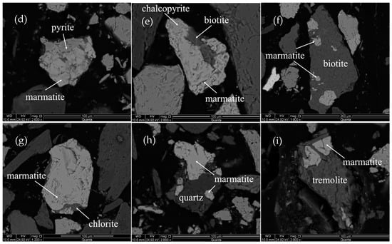 Backscattered electron images of different types of marmatite occurrence within the ore. (a) marmatite; (b) dolomite and marmatite; (c) pyrite, biotite and marmatite; (d) pyrite and marmatite; (e) chalcopyrite, biotite and marmatite; (f) marmatite and biotite; (g) marmatite and chlorite; (h) marmatite and quartz; (i) marmatite and tremolite.