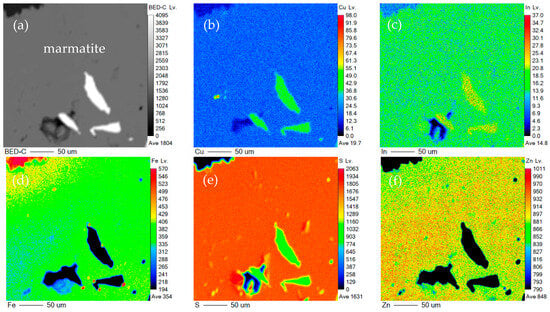 (a–f) Electron probe microanalysis of indium-bearing marmatite in Dulong ore.