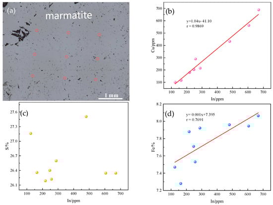 Trace element contents in marmatite. (a) Backscattered electron image of indium-bearing marmatite showing analysis points. Relationships between In and (b) Cu, (c) S, and (d) Fe in marmatite.
