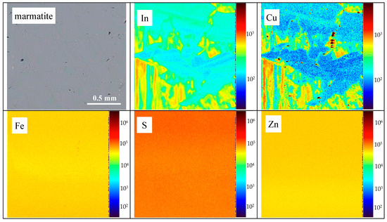 Laser ablation inductively coupled plasma mass spectrometry is a high-efficiency analytical technique capable of simultaneous in situ measurement of precious metals and critical trace elements in mineral phases, while achieving low detection limits [27,35,36]. Here, we used LA–ICP–MS to obtain higher-precision data in relation to indium-bearing marmatite (Figure 10). These data revealed that Cu and In contents in the marmatite ranged from 100 to 700 ppm, exhibiting a strong positive correlation (correlation coefficient = 0.9869) with a slope of 1.04 (Figure 10b). This is consistent with the coupled substitution mechanism 2 Zn2+ ∂ Cu+ + In3+ [26,35,37,38]. Additionally, Fe and In exhibited a moderate positive correlation (Figure 10d; correlation coefficient = 0.7691), suggesting that the presence of Fe facilitates In substitution, whereas S did not correlate with In (Figure 10c). Further elemental mapping visually corroborated the positive correlation between Cu and In (Figure 11 and Figure 12). According to the relevant literature [17], X-ray photoelectron spectroscopy analysis indicates that the valence states of Zn, S, Fe, and In in indium-rich sphalerite of the Dulong deposit are Zn2+, S2−, Fe2+, and In3+, respectively. This, in conjunction with the findings of our study, means that the substitution formula for indium in marmatite can be revised to